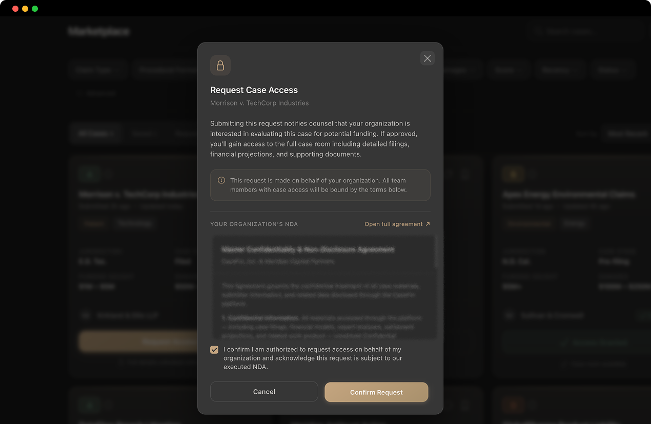 Access is requested intentionally, not assumed. Counsel controls who sees what, and when. Noise stays out. Leverage stays intact.